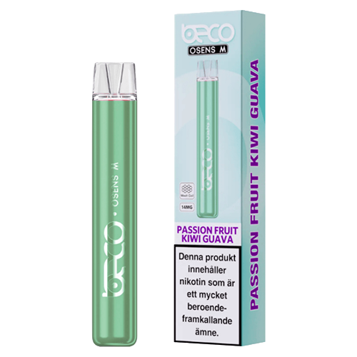 Beco Passion Fruit Kiwi Guava är en engångsvape med smak av passionsfrukt, kiwi och guava med e-vätska och är avsedd att användas direkt utan laddning eller inställningar. Den är gjord för att vara enkel i formatet och kommer i flera olika smaker.