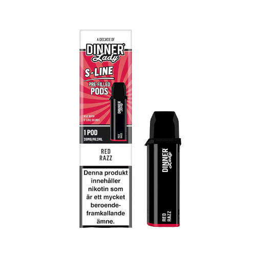 Dinner Lady S-line Mesh Pod Red Razz är förfyllda pods med smak av hallon som används tillsammans med Dinner Lady S-line batteri som säljs separat. Podden är en färdig kapsel med e-vätska och mesh-coil, vilket gör att du slipper påfyllning och krångliga inställningar. Du klickar i podden i batteriet och använder den tills e-vätskan tagit slut. Podden innehåller 2 ml e-vätska med 20 mg nikotinsalt och finns i flera smaker.