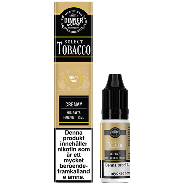 Dinner Lady Salts Creamy Tobacco är en 10 ml nikotinsalt‑e‑vätska (14 mg/ml) med smak av Creamy Tobacco. Avsedd för påfyllningsbara e‑cigaretter och podsystem.