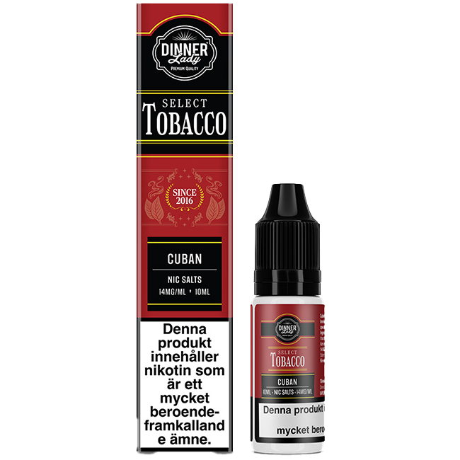 Dinner Lady Salts Cuban Tobacco är en 10 ml nikotinsalt‑e‑vätska (14 mg/ml) med smak av Cuban Tobacco. Passar påfyllningsbara e‑cigaretter och podsystem.