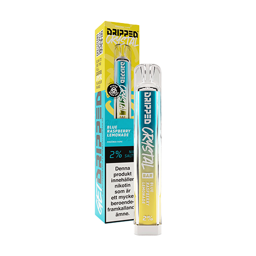 Dripped Crystal Bar Blue Raspberry Lemonade är en engångsvape med smak av blå hallon och lemonad. Produkten innehåller nikotinsaltbaserad e-vätska med en koncentration på 20mg/ml och levererar upp till 600 puffar, beroende på användning.