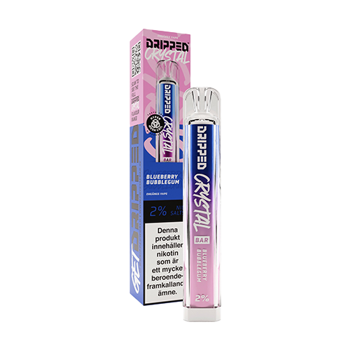 Dripped Crystal Bar Blueberry Bubblegum är en engångsvape med smak av blåbär. Produkten innehåller nikotinsaltbaserad e-vätska med en koncentration på 20mg/ml och levererar upp till 600 puffar, beroende på användning.