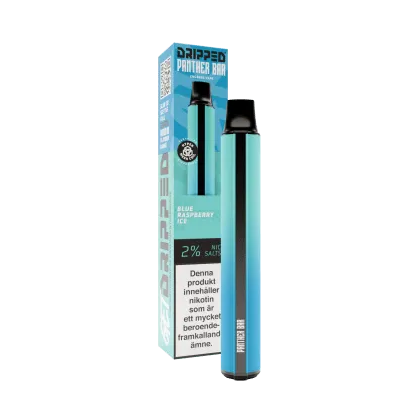 Dripped Panther Bar Blue Raspberry Ice är en engångsvape med en kylande ton och smak av blå hallon. Produkten innehåller nikotinsaltbaserad e-vätska med en koncentration på 20 mg/ml och levererar upp till 800 puffar, beroende på användning.