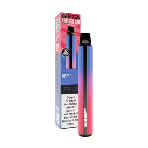 Dripped Panther Bar Energy Ice är en engångsvape med en kylande ton och smak av energidryck. Produkten innehåller nikotinsaltbaserad e-vätska med en koncentration på 20 mg/ml och levererar upp till 800 puffar, beroende på användning.