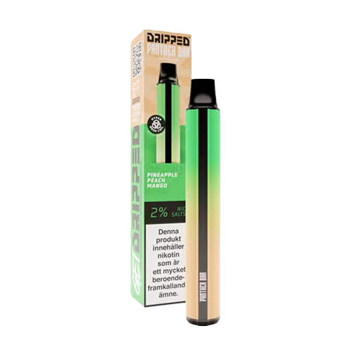 Dripped Panther Bar Pineapple Peach Mango är en engångsvape med en smak av ananas, persika och mango. Produkten innehåller nikotinsaltbaserad e-vätska med en koncentration på 20 mg/ml och levererar upp till 800 puffar, beroende på användning.