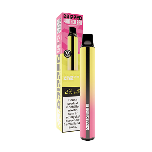 Dripped Panther Bar Strawberry Banana är en engångsvape med en smak av jordgubb och banan. Produkten innehåller nikotinsaltbaserad e-vätska med en koncentration på 20 mg/ml och levererar upp till 800 puffar, beroende på användning.