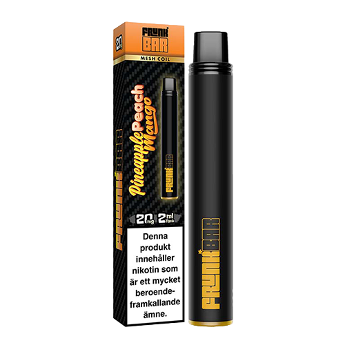 Frunk Bar Pineapple Peach Mango är en engångsvape med smak av ananas, persika och mango som används utan påfyllning eller laddning. Produkten är förfylld men en nikotinbaserad e-vätska och är avsedd att användas direkt utan inställningar.