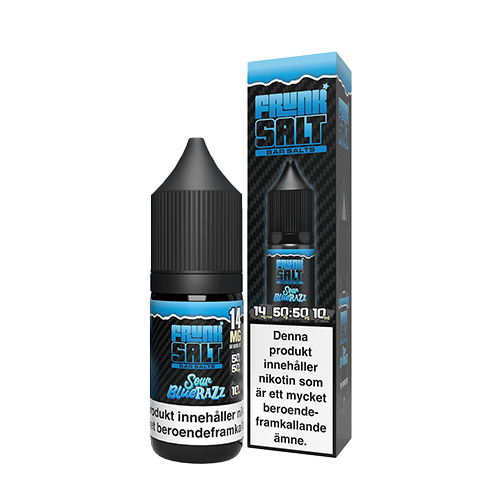 Frunk Bar Salt Sour Blue Razz är en e-juice med smak av blå hallon. Produkten innehåller nikotinbaserad e-vätska med en koncentration på 14 mg/ml och är avsedd för användning i påfyllningsbara e-cigaretter.