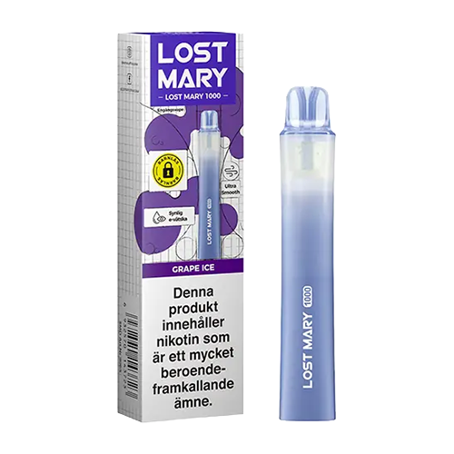 Lost Mary 1000 Grape Ice är en engångsvape med en kylande ton och smak av vindruvor. Produkten tillhör kategorin engångsvape och är avsedd engångsbruk.