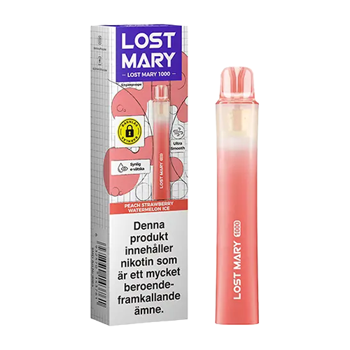 Lost Mary 1000 Peach Strawberry Watermelon Ice är en engångsvape med en kylande ton samt smak av persika, jordgubb och vattenmelon. Produkten tillhör kategorin engångsvape och är avsedd engångsbruk.