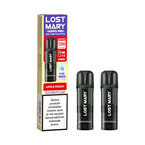 Lost Mary Tappo Pro Pod är en förfylld pod avsedd för användning med Lost Mary Tappo Pod Kit och Lost Mary Air Pod Kit. Produkten Innehåller två pods med 2 ml e-vätska per pod och har smak av äpple och persika. Varje pod ger upp till cirka 1000 puffar, beroende på användning. Pods från Lost Mary Tappo-serien är föryllda och färdiga att använda direkt.