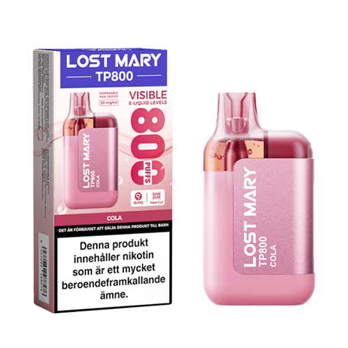 Lost Mary TP800 Cola är en engångsvape med smak av cola. Produkten levererar upp till cirka 800 puffar per enhet, beroende på användning. Den är framtagen för enkel användning utan behov av laddning, påfyllning och underhåll.