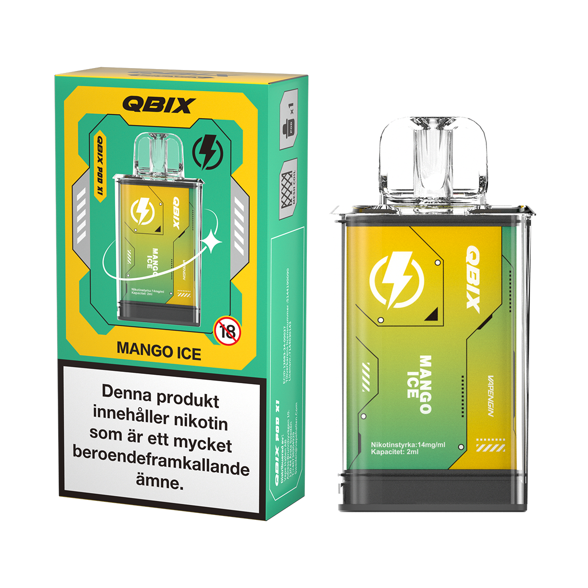 - QBIX Pod Mango Ice (14 mg): Smak av mango.