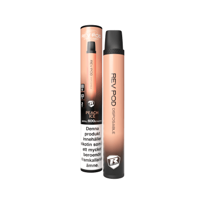Rev Pod Peach Ice är en engångsvape med smak som påminner om persika och har en kylande ton. Produkten innehåller 2 ml e-vätska med 10 mg/ml nikotin och är utrustad med ett inbyggt batteri.
