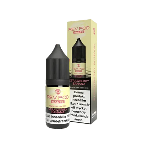 Rev Pod Salts Strawberry Banana lyfter fram smak av jordgubb och banan. Produkten innehåller nikotinsaltbaserad e-vätska med en koncentration på 14 mg/ml och är framtagen för användning i påfyllningsbara e-cigaretter och podsystem