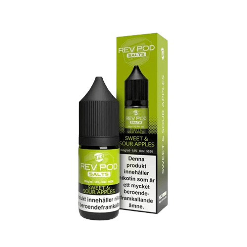 Rev Pod Salts Sweet Sour Apples har en smak som påminner om äpple. Produkten innehåller nikotinsaltbaserad e-vätska med 14 mg/ml nikotin, avsedd för påfyllningsbara e-cigaretter och podsystem.