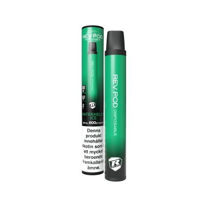 Rev Pod Watermelon Ice är en engångsvape med en smak som påminner om vattenmelon och har en kylande ton. Produkten innehåller 2 ml e-vätska med 10 mg/ml nikotin och har ett inbyggt batteri.