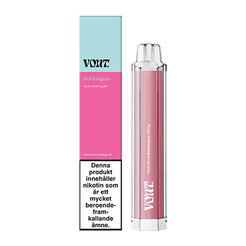 Vont Nova Bubblegum är en engångsvape med mesh-coil och en avlång design samt smak av frukt. Vont Nova finns även i flera olika smaker.