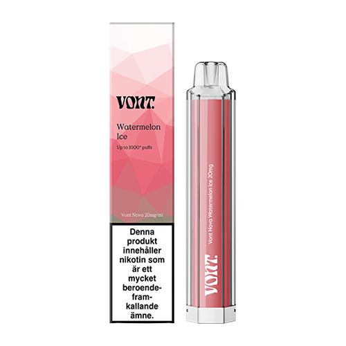 Vont Nova Watermelon Ice är en engångsvape med mesh-coil och en avlång design samt smak av vattenmelon. Vont Nova finns även i flera olika smaker.